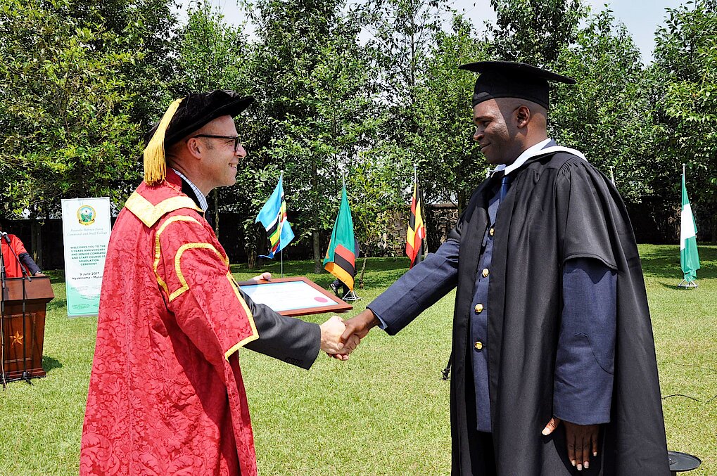 46 Senior Officers from Rwanda Defence Force and Allied Defence Forces graduated from the one year long Senior Command and Staff Course Intake Five (SCSC 05), at Rwanda Defence Force Command and Staff College ( RDFCSC) in Musanze District, Northern Rwanda. Among the 46 SCSC Passed Staff Course ‘psc’ graduates, 40 were in addition conferred academic qualifications by the University of Rwanda; 27 with Masters of Arts in Security Studies and 13 with Post Graduate Diplomas in Security Studies.