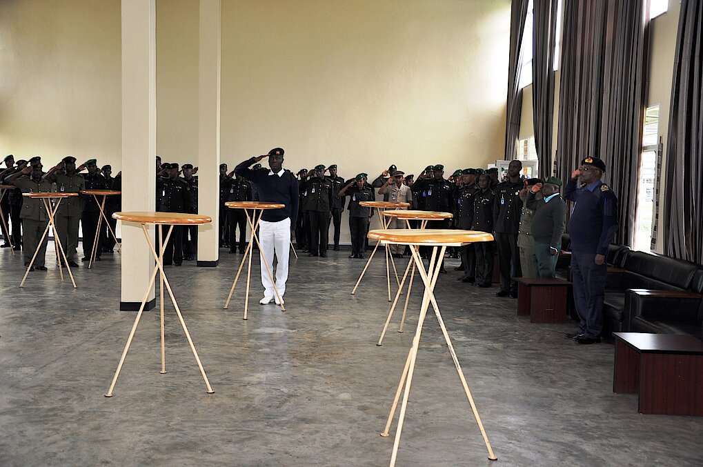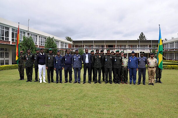 Photo: Col W DZANDU-HEDIDOR (arrowed), chief celebrant, flanked by the Chief Instructor, Col JC NGENDAHIMANA (left) and Dr AGGEE SHYAKA, guest lecturer (right) from University of Rwanda and other Directing Staff and allied students.